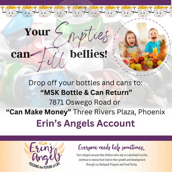 Did you know that something as simple as returning your bottles and cans can make a BIG difference in the fight against childhood hunger? We're excited to announce that we have an account at MSK Bottle & Can Return in Liverpool and "Can Make Money" in Three Rivers Plaza in Phoenix.