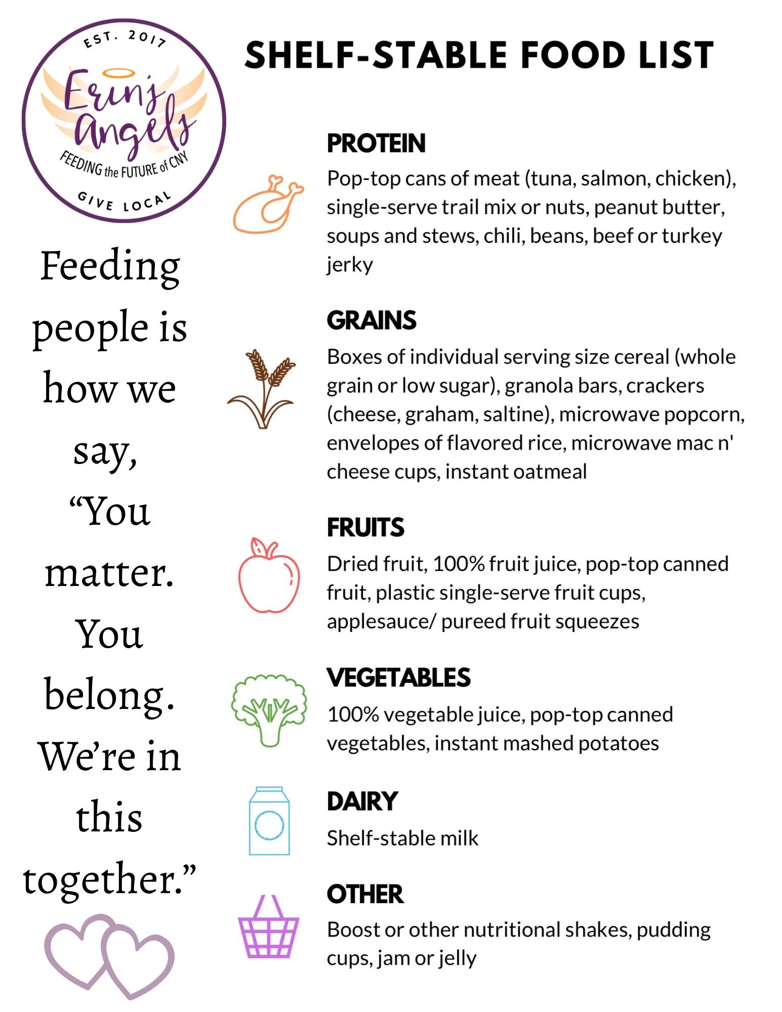 The unfortunate reality is that many children in our area are facing food insecurity, and we believe that together, we can alleviate some of their burdens and bring smiles to their faces. Download this brochure and flyer to collect needed items for the weekend backpack program! If you would like a cobranded flyer with your company logo please email Sheila at sheila@erinsangels.com.